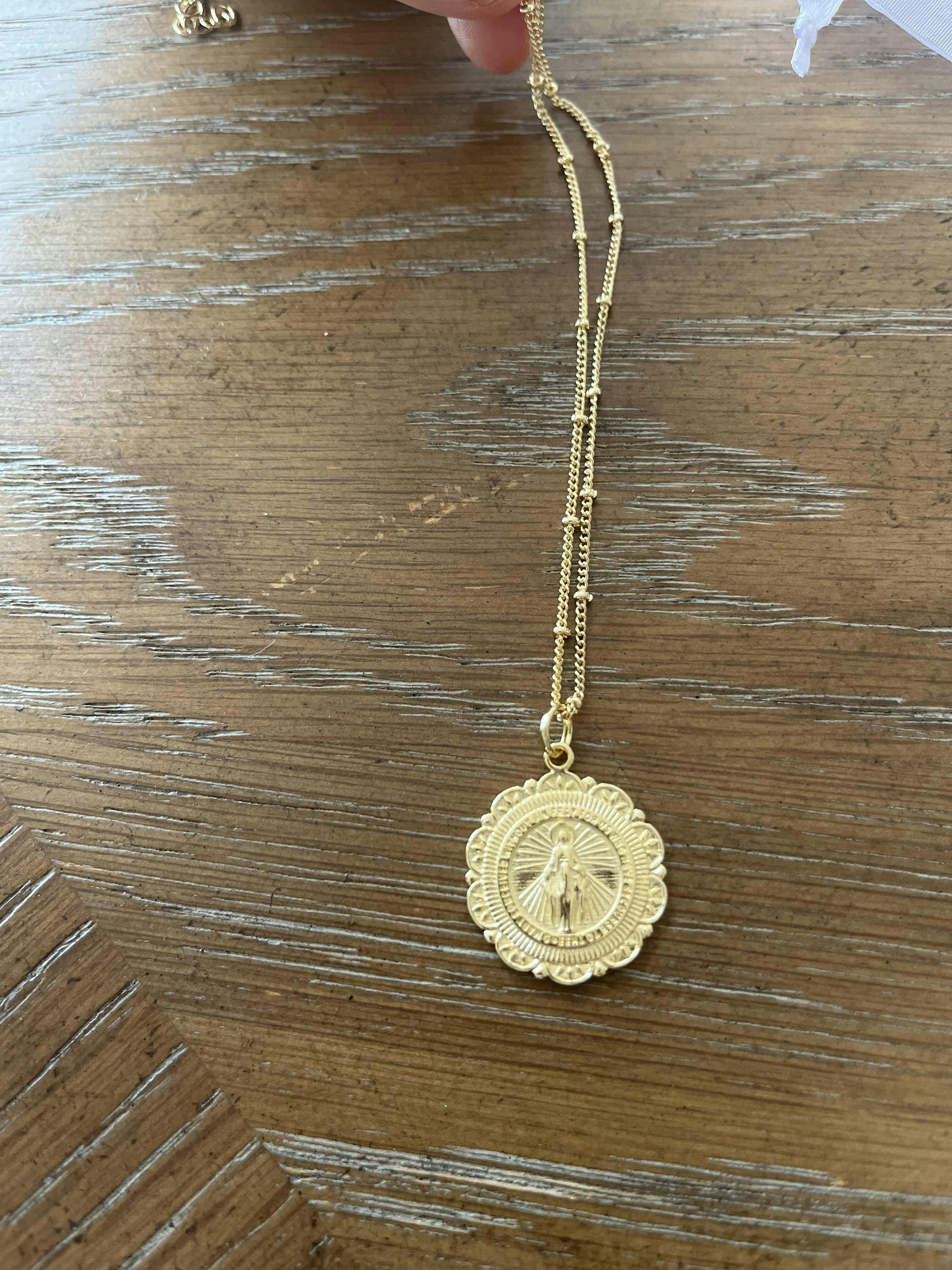 The ‘Floral Miraculous Medal Necklace’ features a larger miraculous medal than our Classic Miraculous Medal Necklace with a scalloped floral outer detailing.